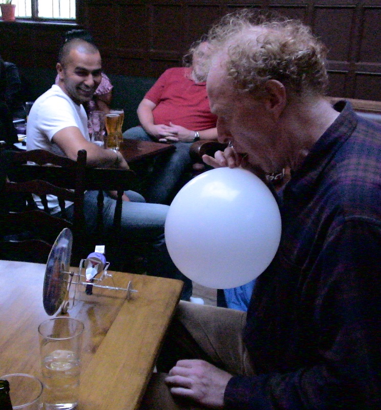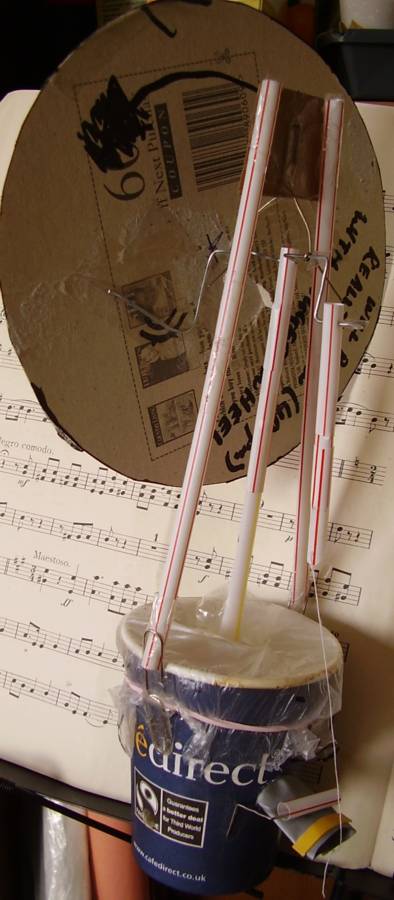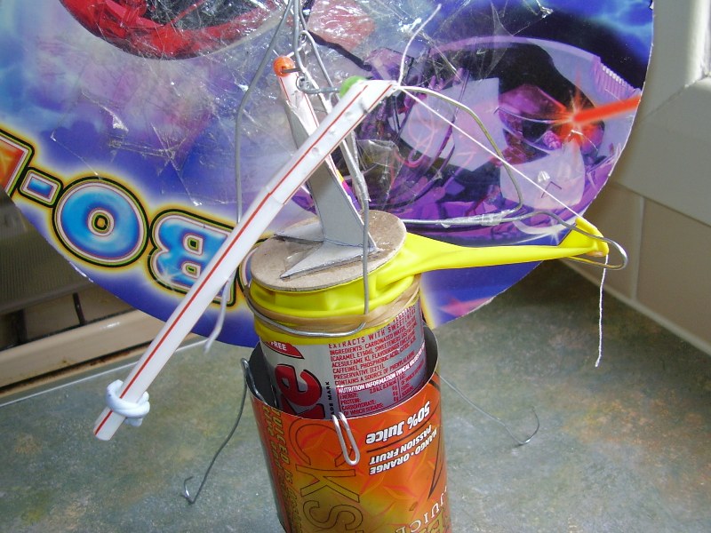 It works by blowing into a paper cup. This inflates a polythene diaphragm which in turn pushes on a crank. The crank pulls a thread which opens & closes an exhaust valve. The valve is made from the neck of a party balloon, it has a small piece of slightly curved card super-glued to it's upper side, this helps the valve to open & close properly. A bit of drinking straw radiuses the valve support and allows the tube to fold round it without creasing although in later versions I abandoned this idea.