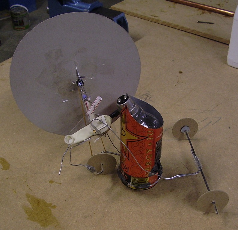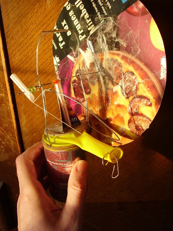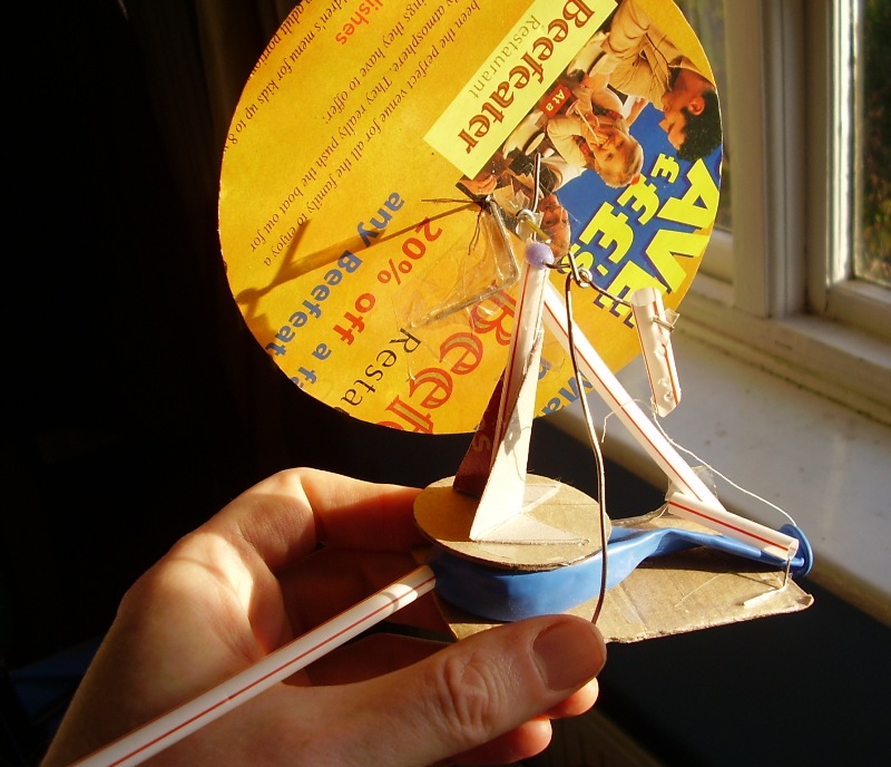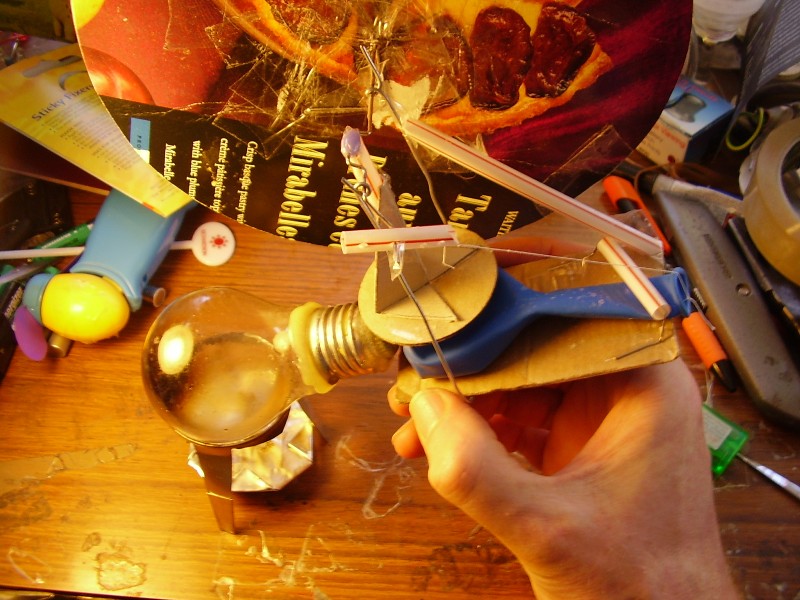 bent wire crank works in palm of hand; drinking-straw con rod is sellotaped to thumbnail