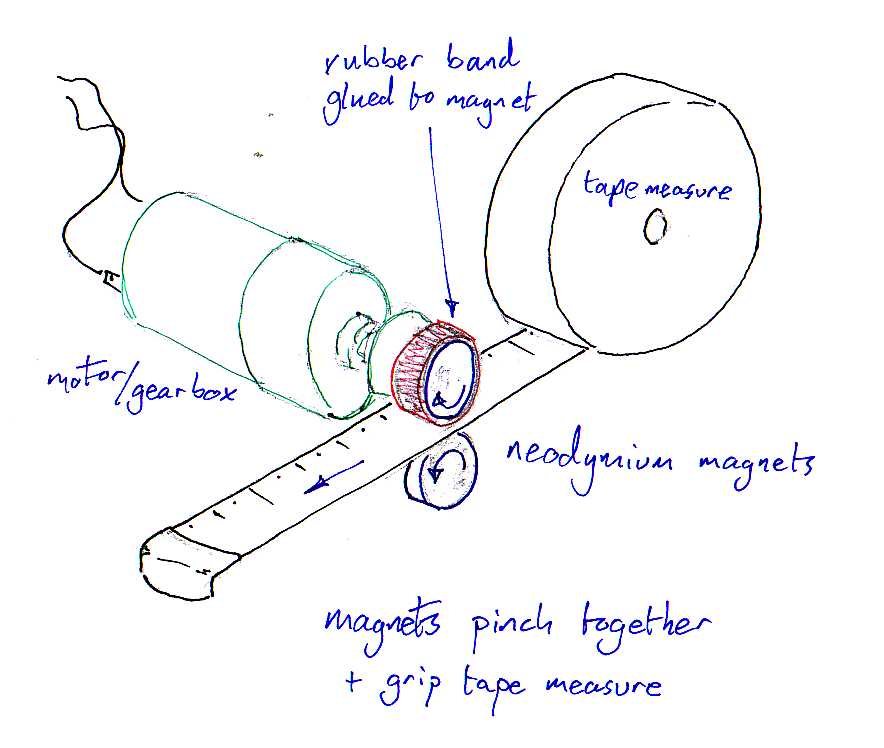 the drawing shows it balanced on the edge of the table with its drive mechanism hanging down so that the drive wheels are just above table-level